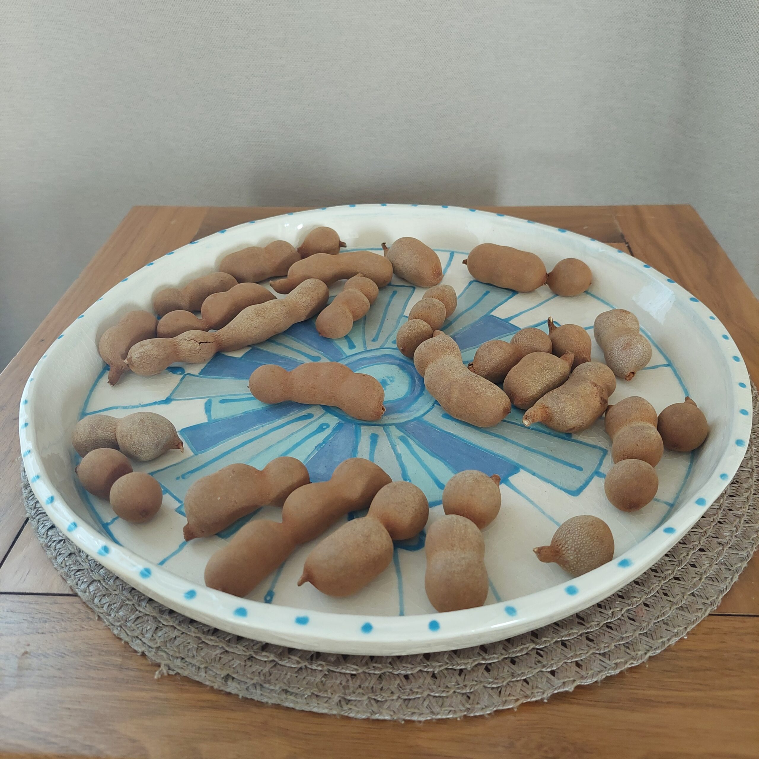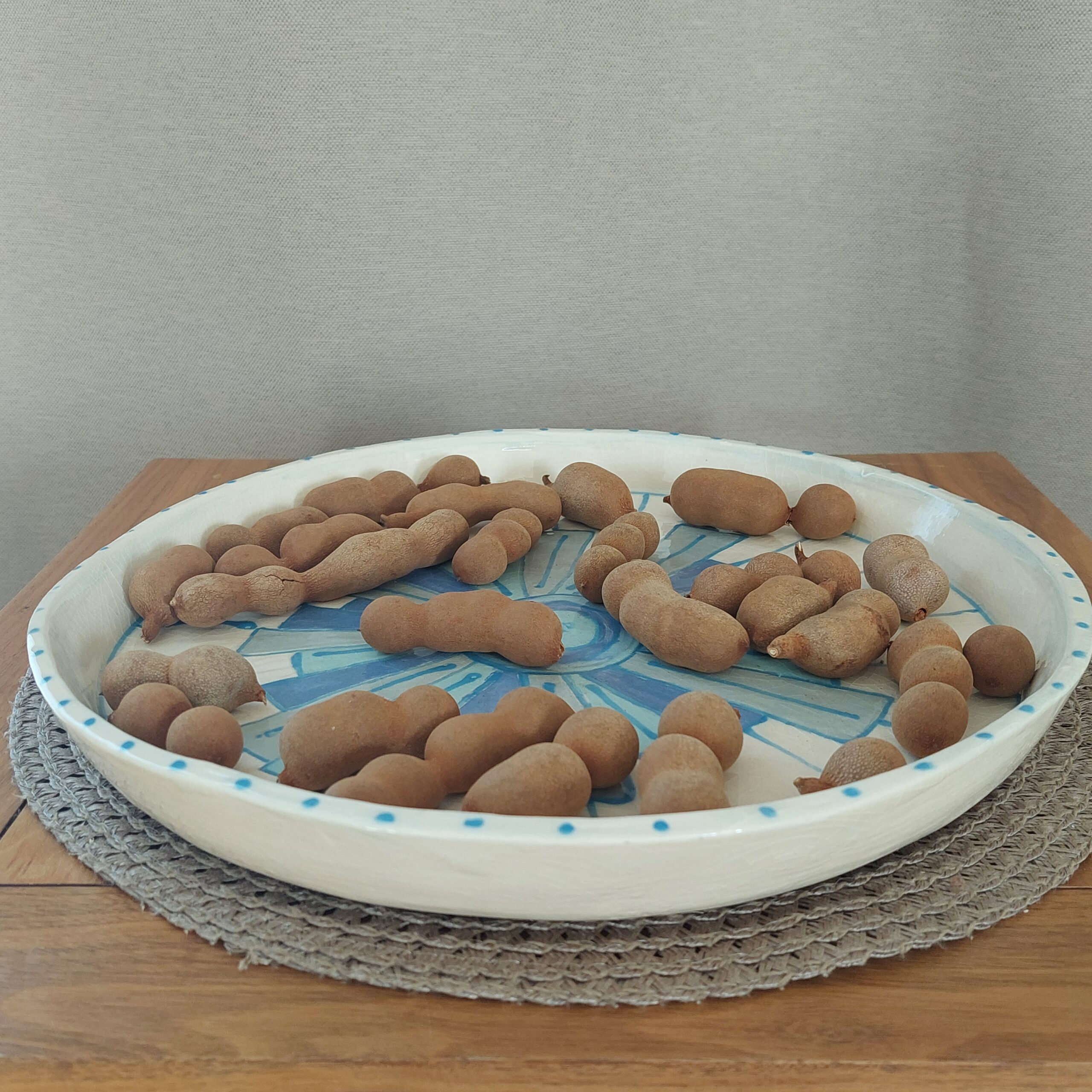 Keraminė rankų darbo lėkštė „Planetos“, skirta serviruoti maistą arba naudoti kaip tortinę. Baltasis šamotinis molis, angoba, bespalvė glazūra. Skersmuo 34 cm, aukštis 5 cm. Spalvos: balta, žydra.