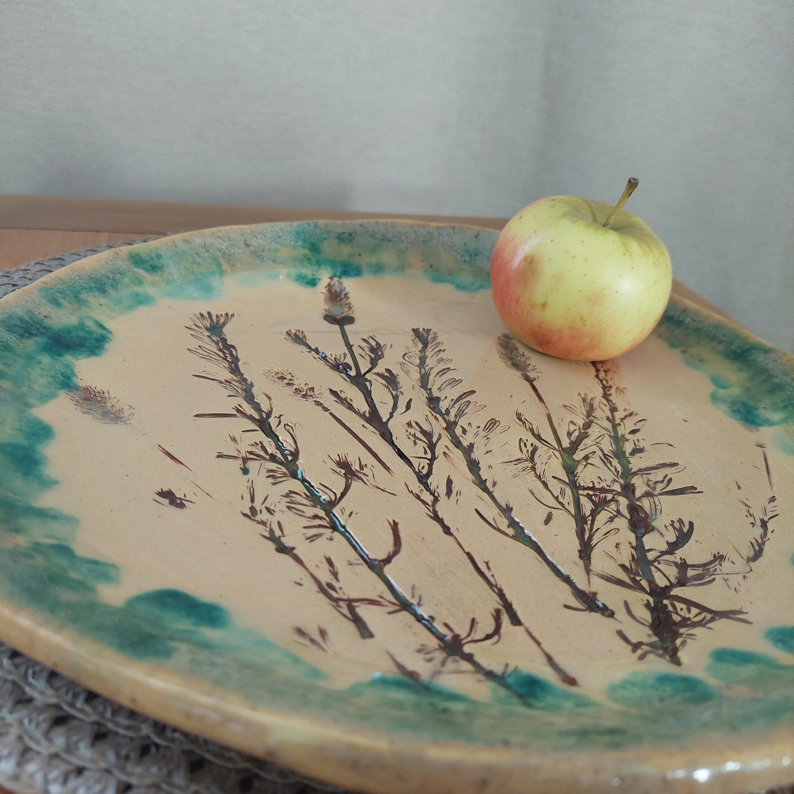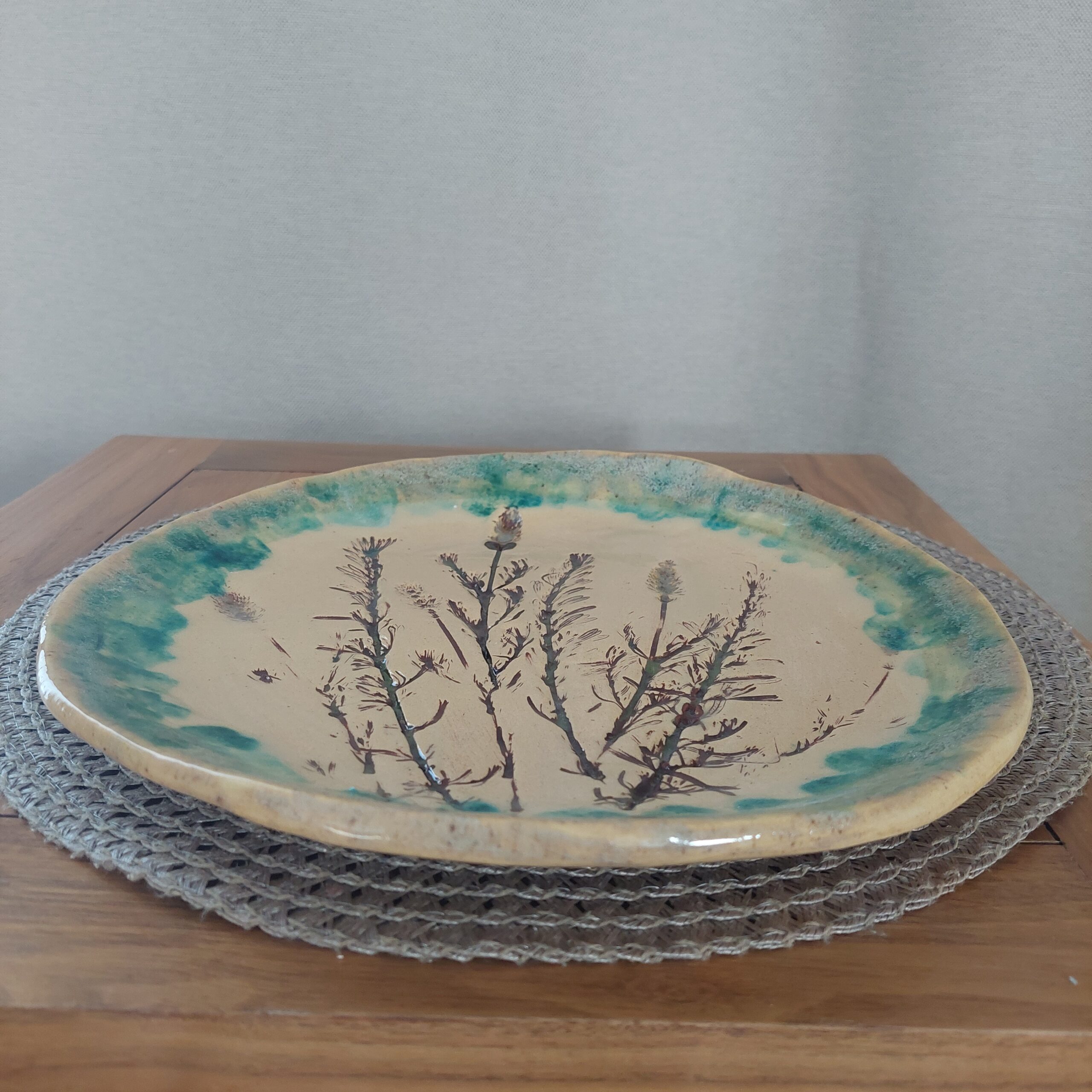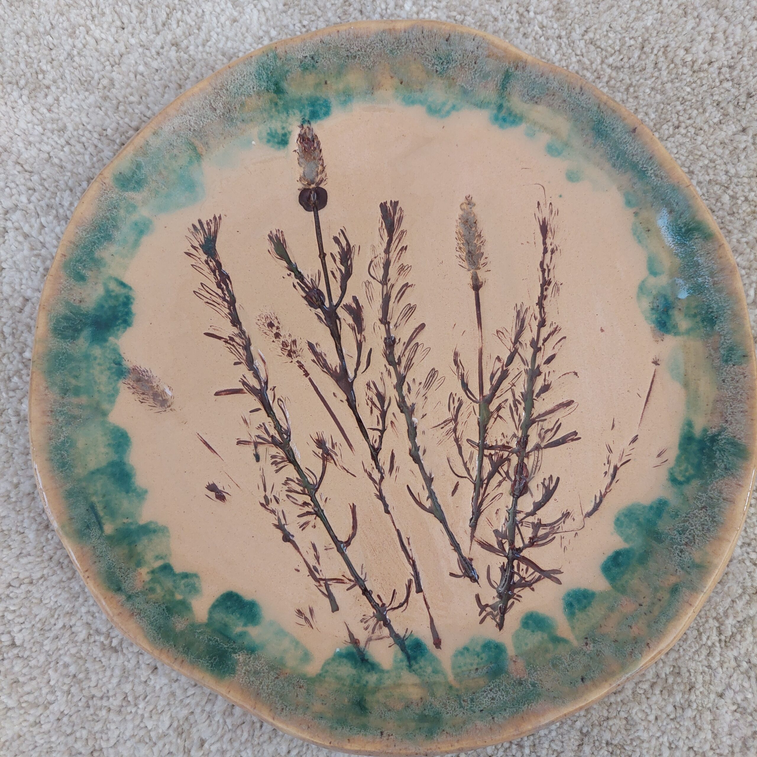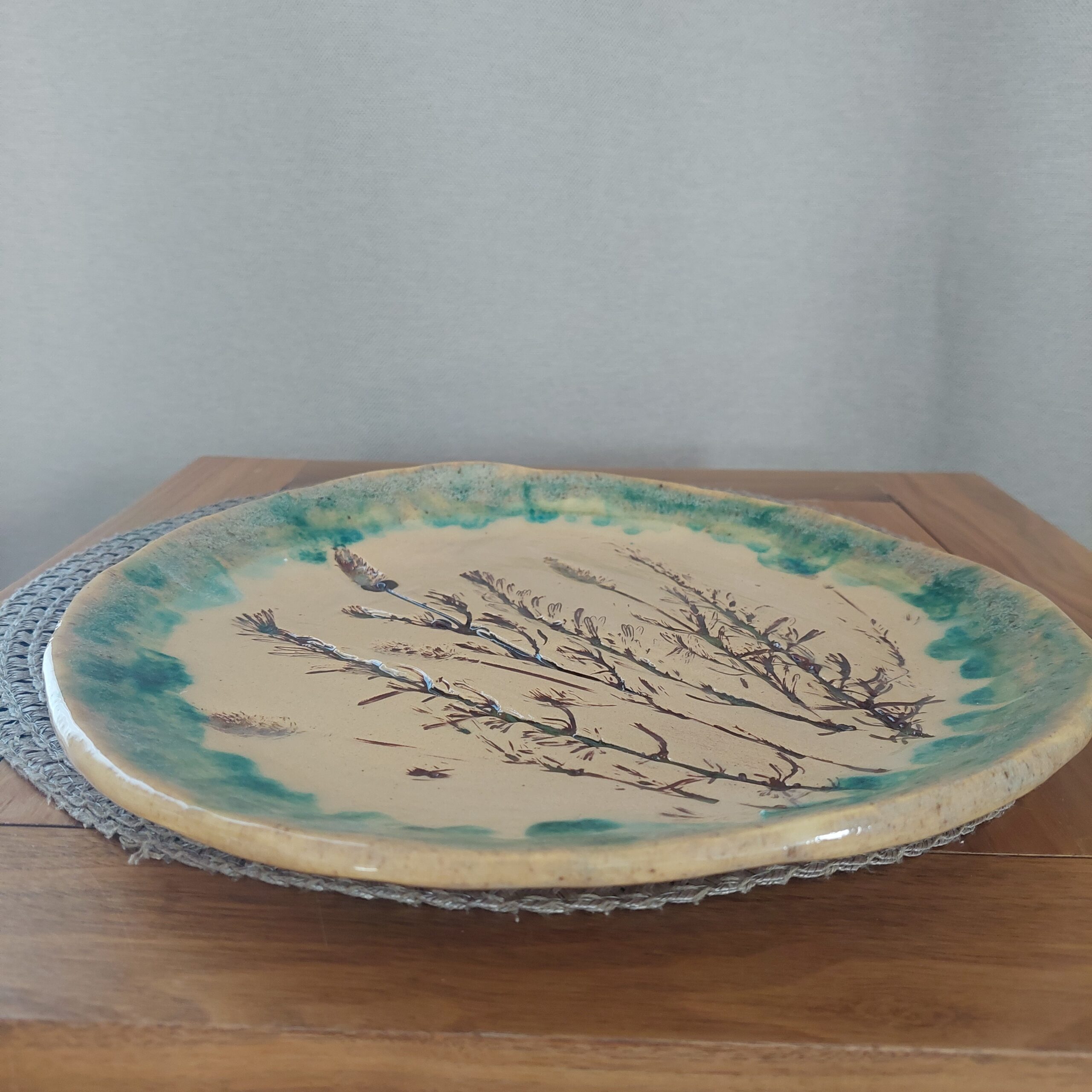 Keraminė rankų darbo lėkštė „Levandos“, skirta serviruoti maistą arba galima naudoti kaip tortinę. Gelsvasis molis, glazūra. Skersmuo 30 cm, aukštis 3 cm. Spalvos: kreminė, ruda, žalia.