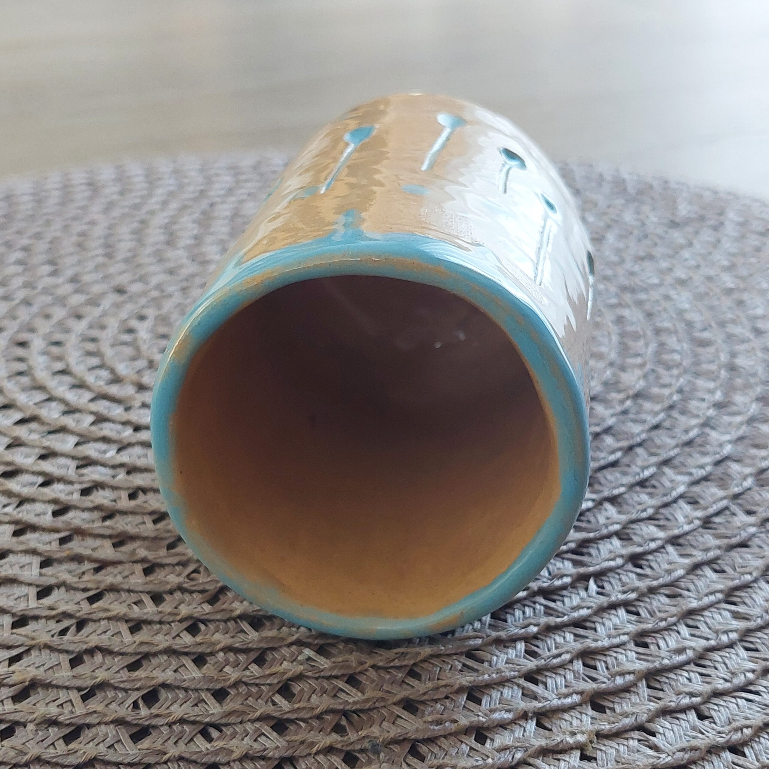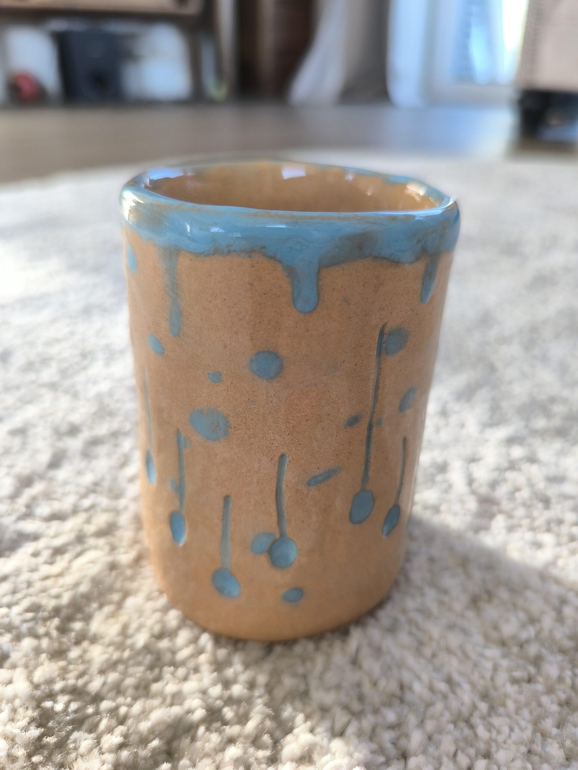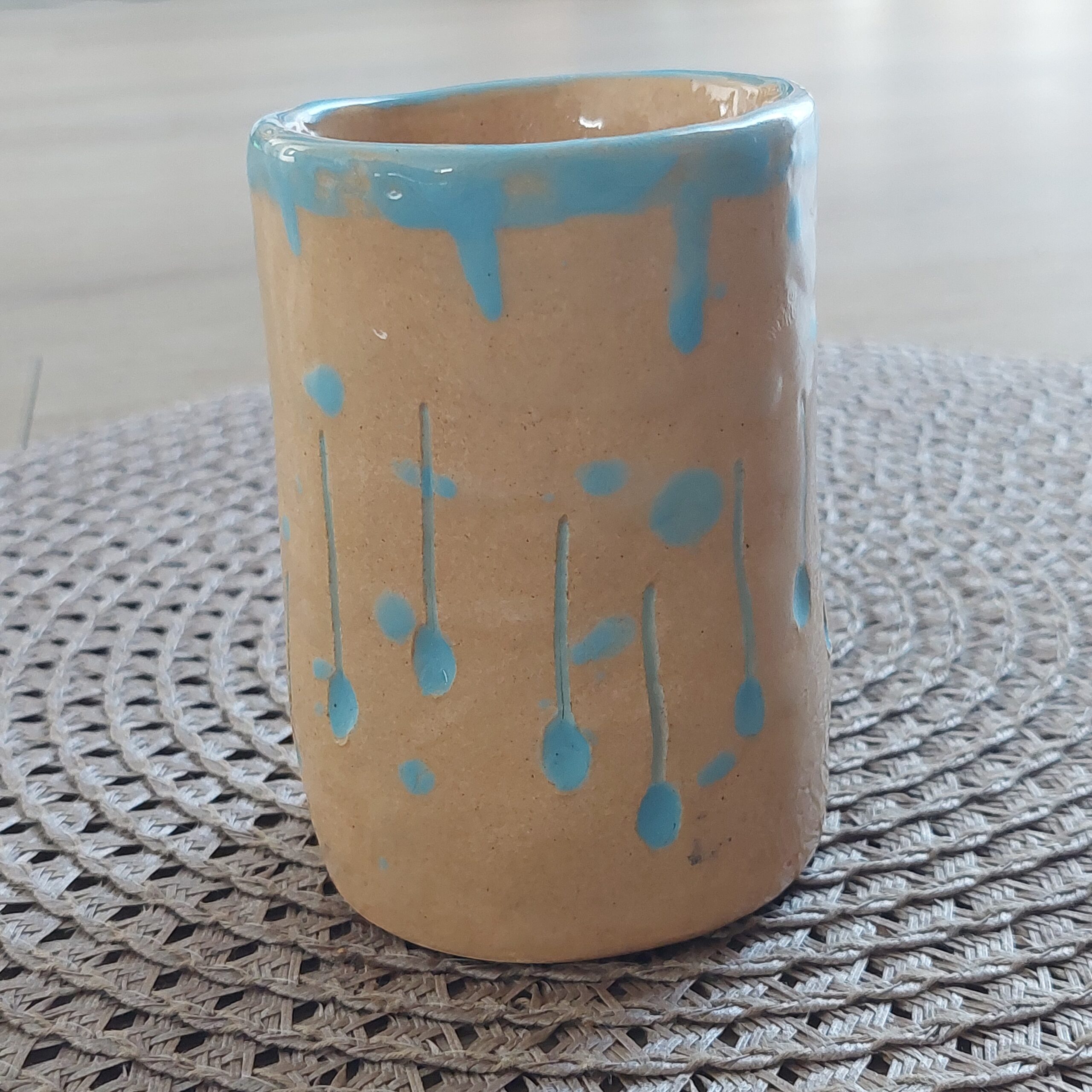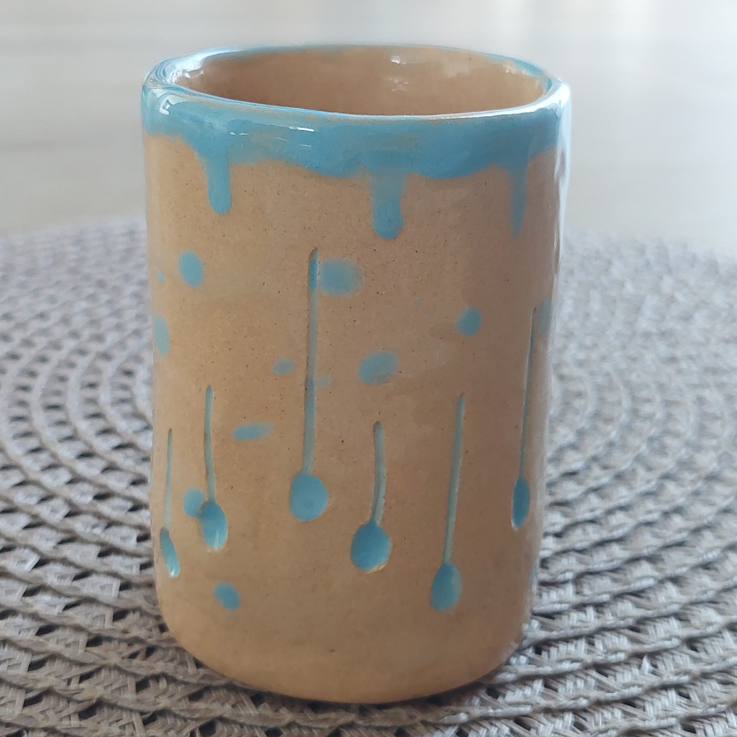 Keraminė rankų darbo stiklinė „Žydri lašai“. Geltonas molis, glazūra. Neskirta pilti labai karšto vandens gėrimų, kadangi praleidžia karštį. Skersmuo 6,5 cm, aukštis 9,5 cm. Spalvos: žydra, smėlio.