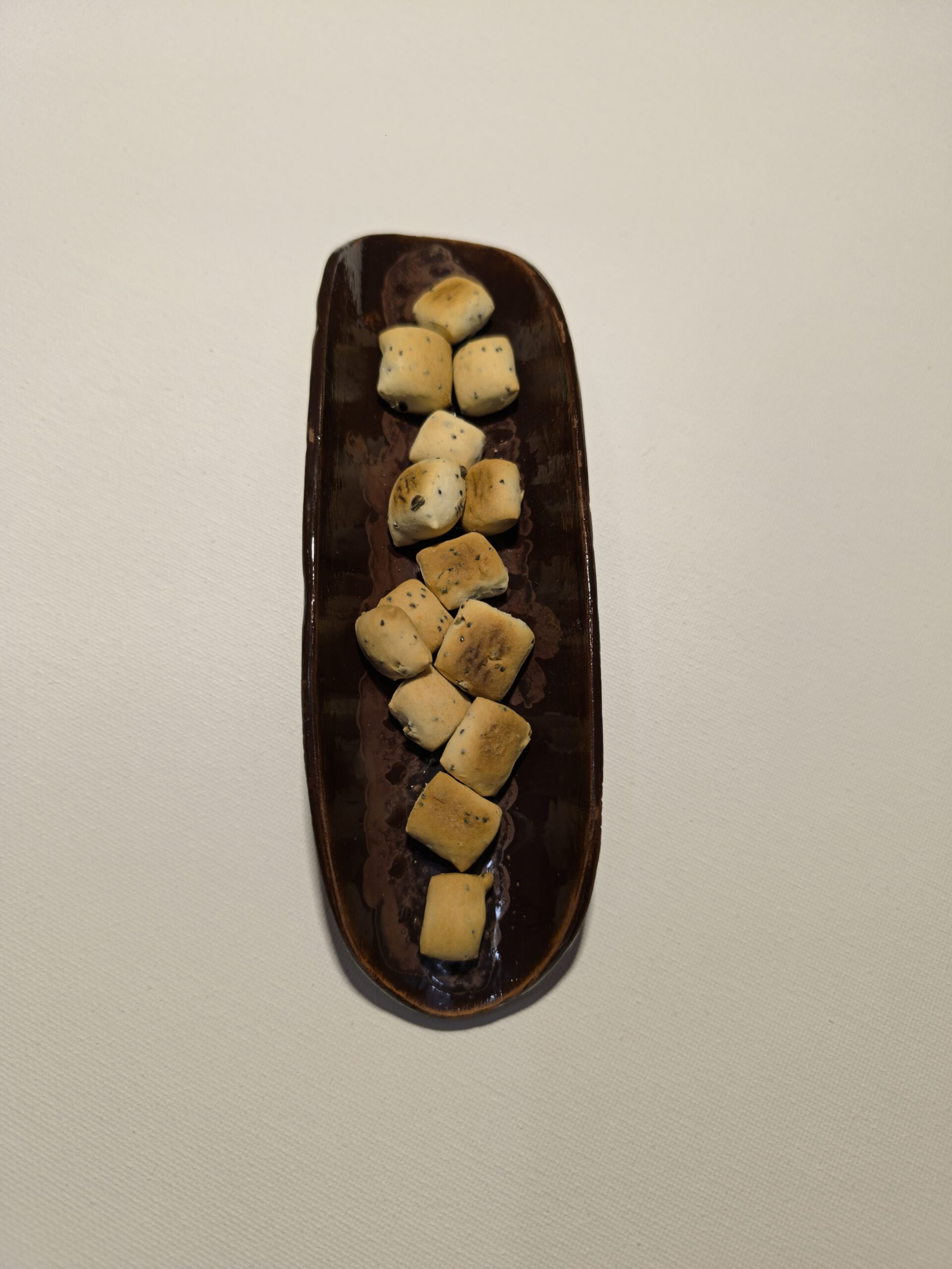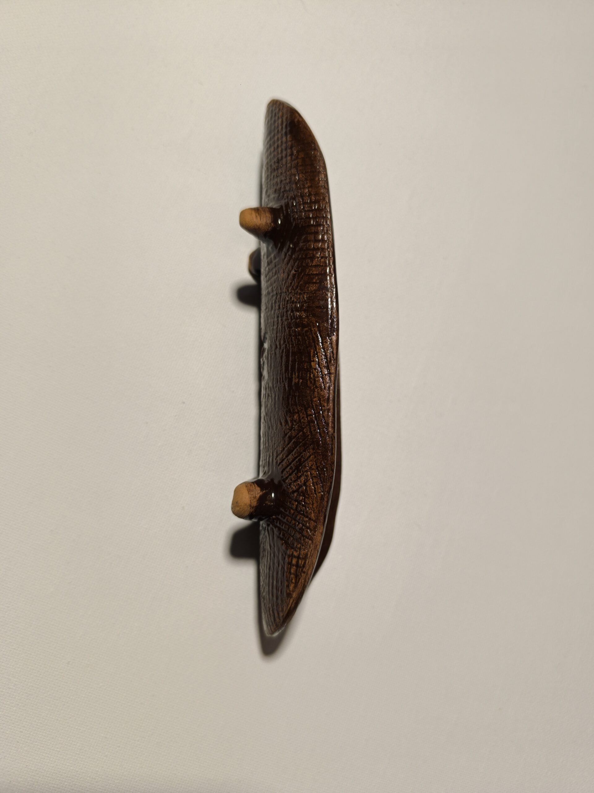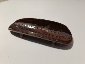 Mažas dubenėlis smulkiems produktams. Raudonas molis, blizgi glazūra. Ilgis 18 cm, plotis 5,5 cm.