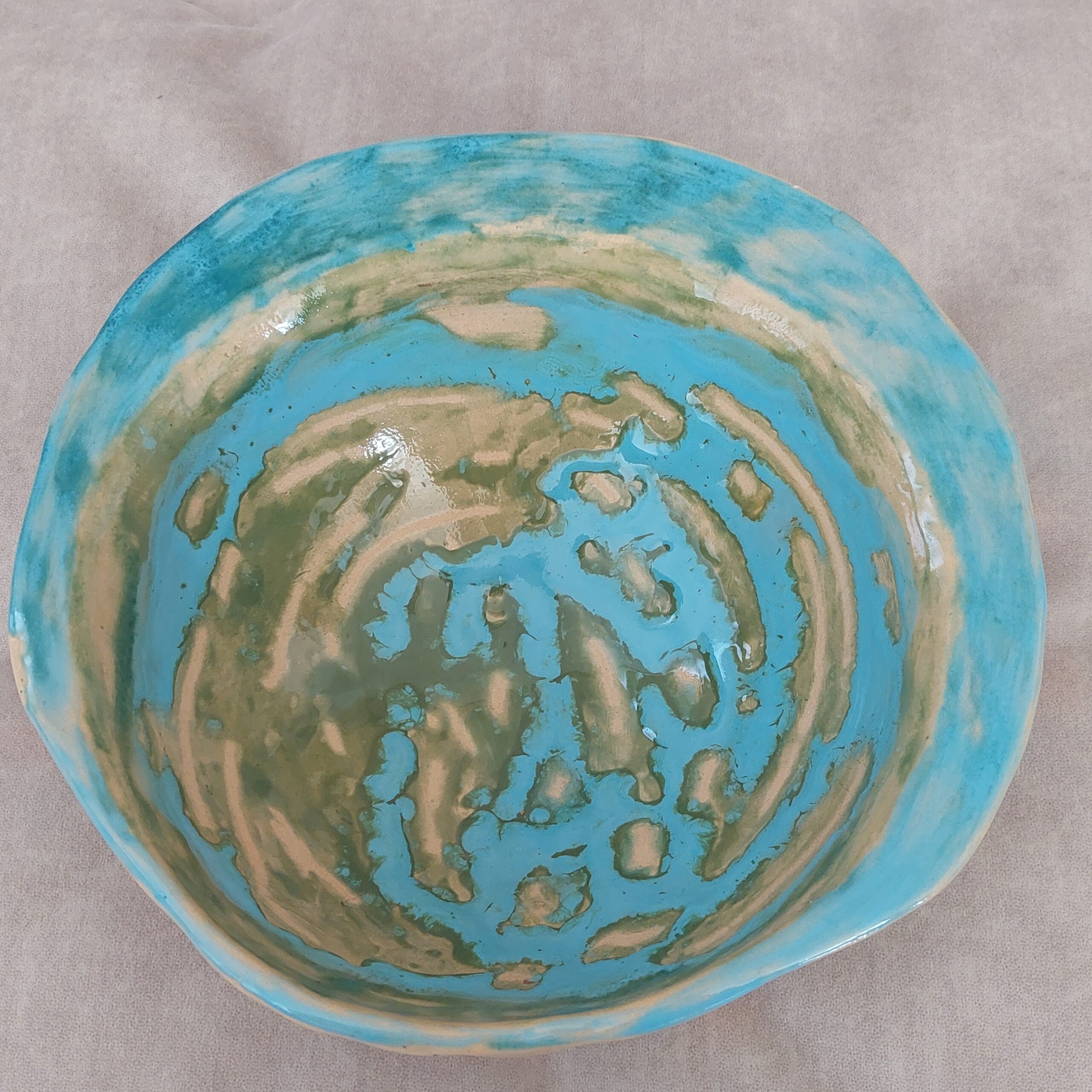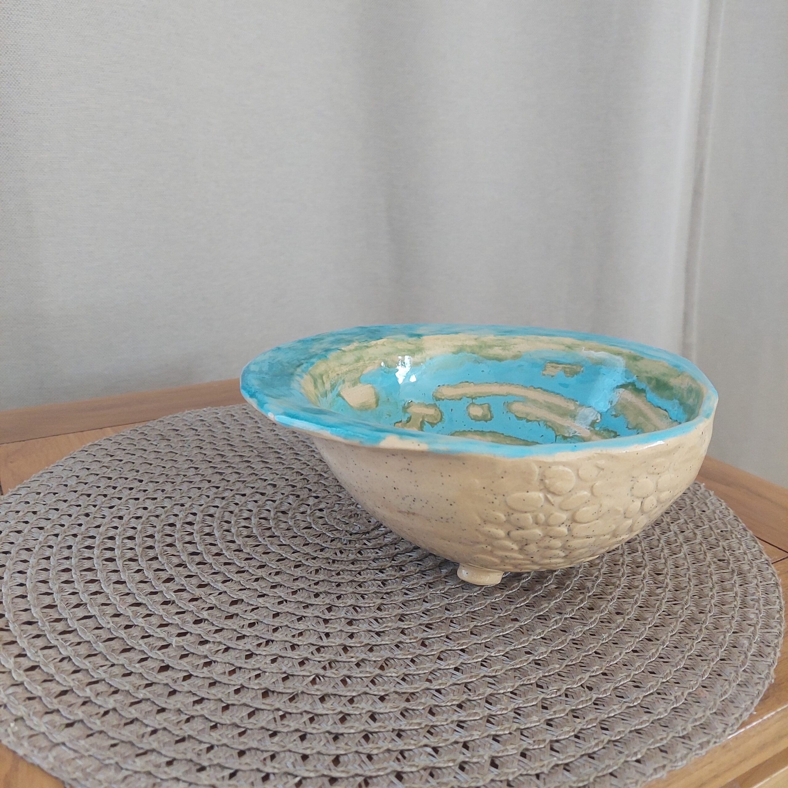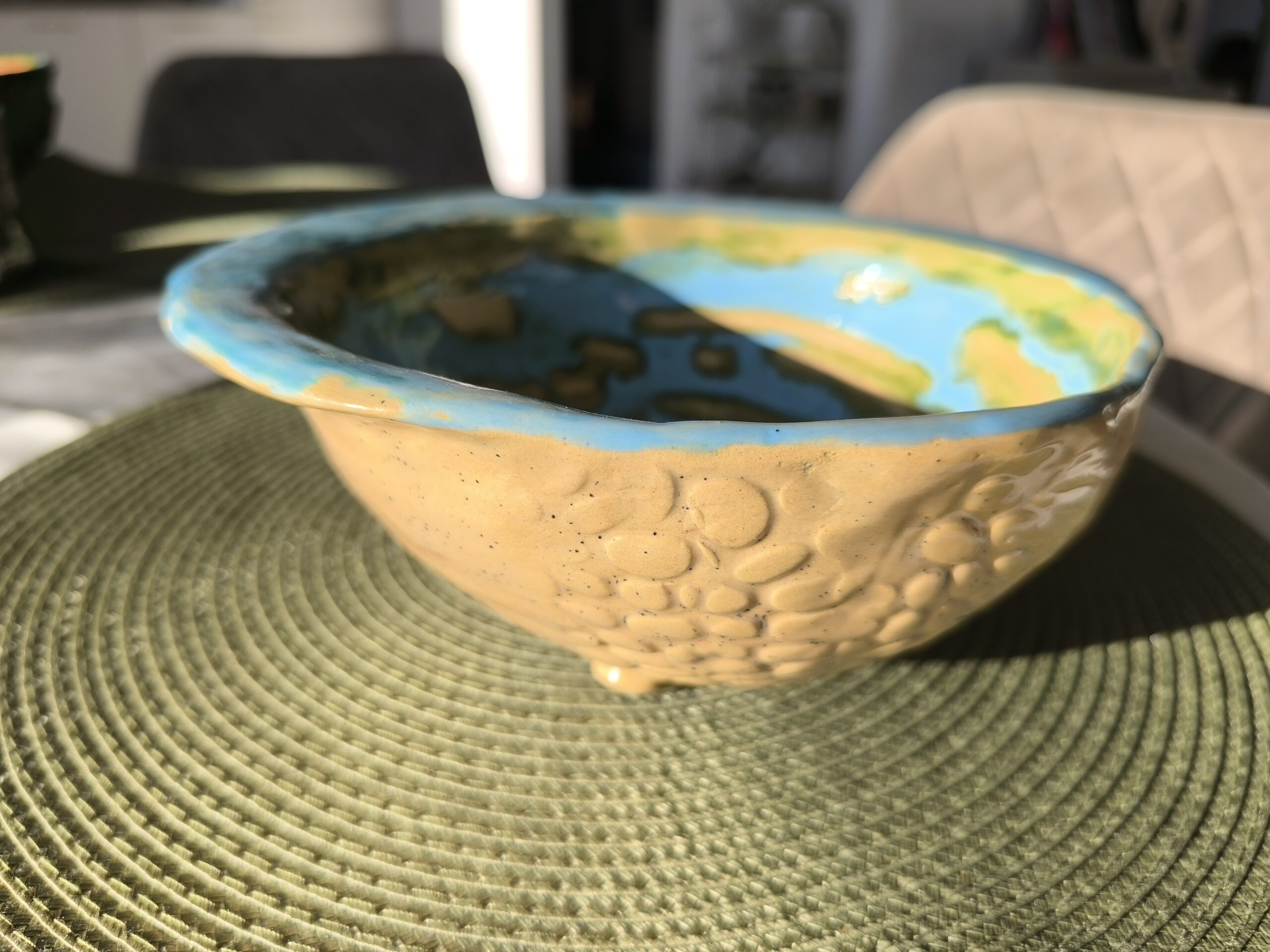 Keraminis rankų darbo dubuo „Jūros dugne“. Geltonas molis, įvairios glazūros. Tinka maistui ir ne tik. Plotis 18 cm, aukštis 8,5 cm. Spalvos: gelsva, žydra.