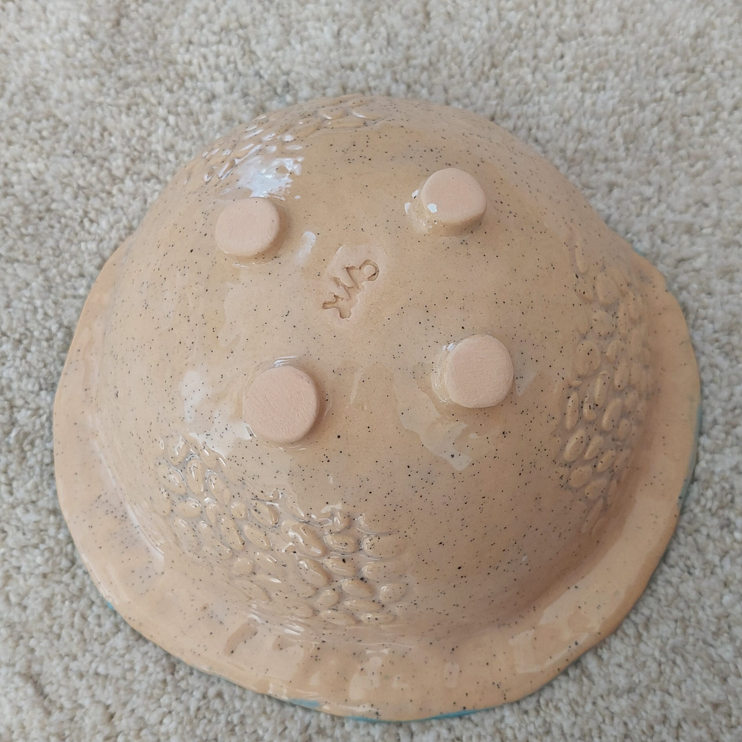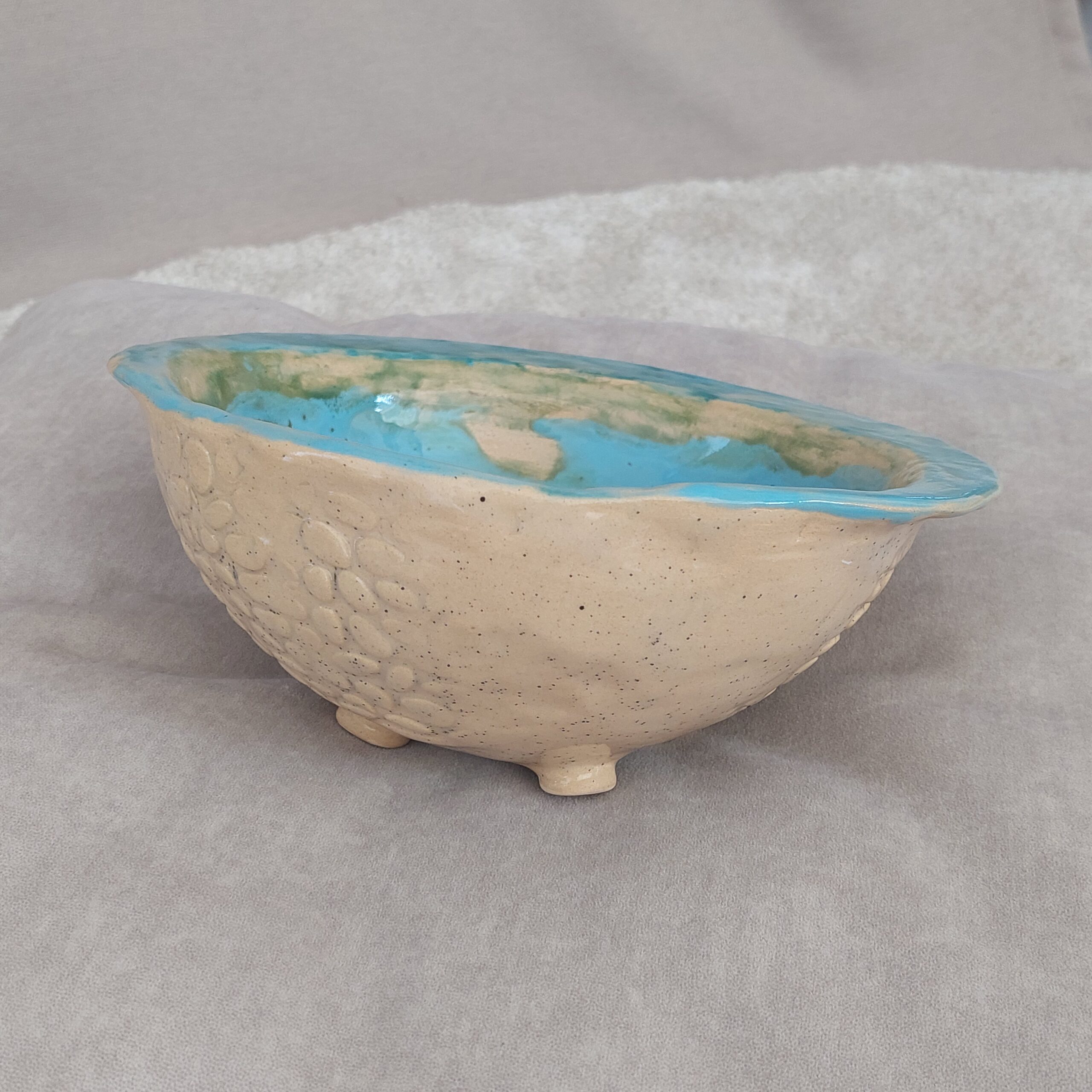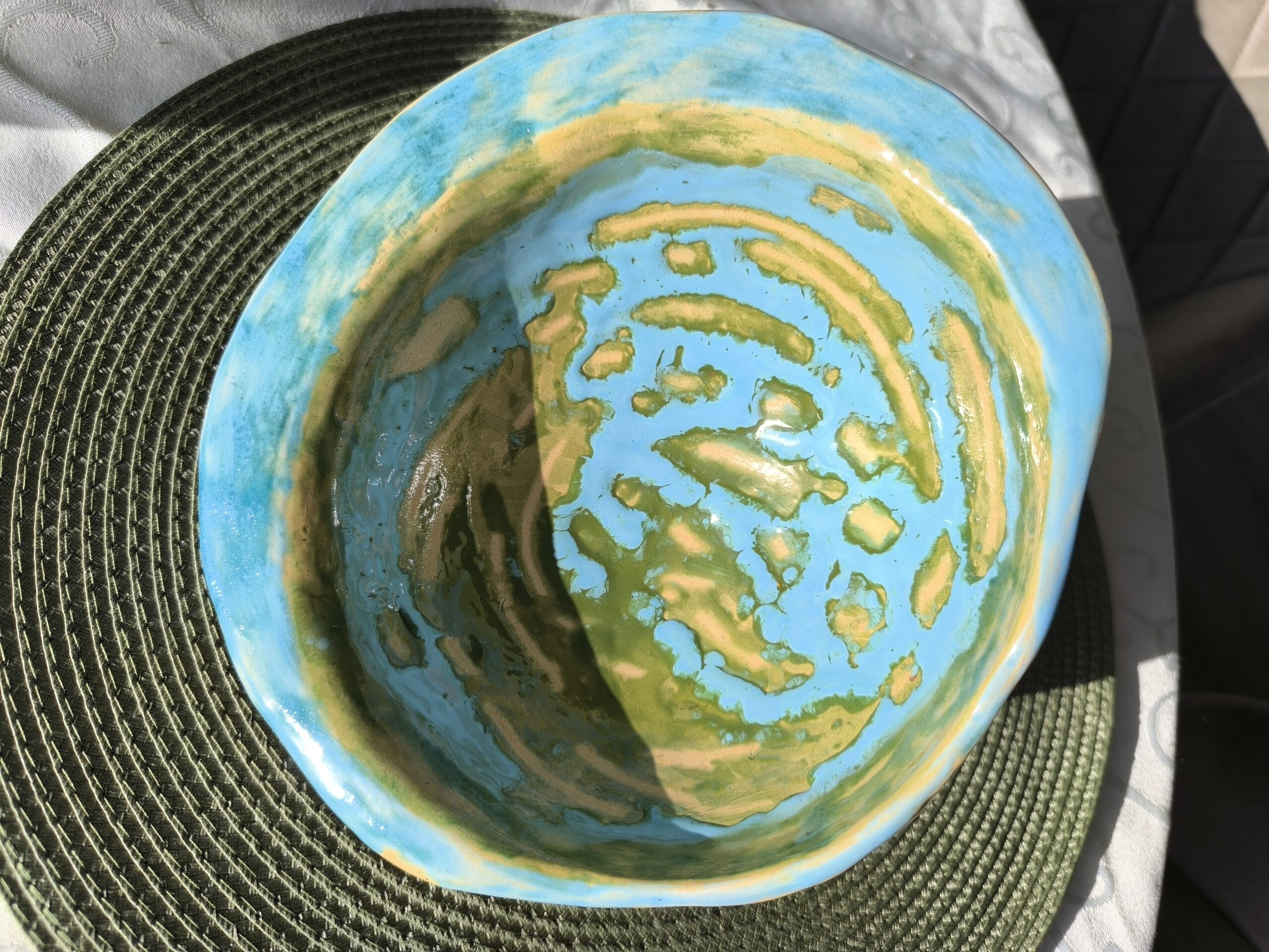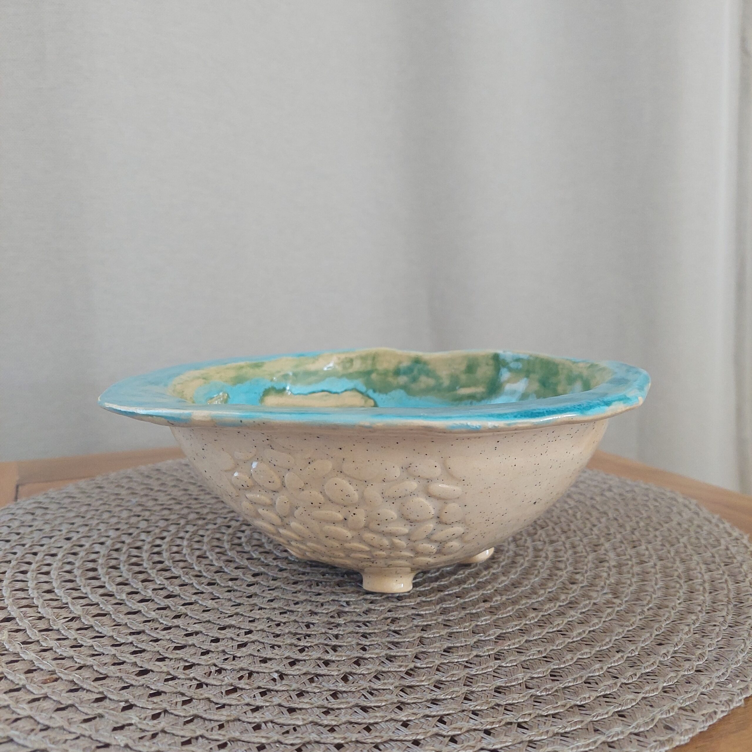 Keraminis rankų darbo dubuo „Jūros dugne“. Geltonas molis, įvairios glazūros. Tinka maistui ir ne tik. Plotis 18 cm, aukštis 8,5 cm. Spalvos: gelsva, žydra.