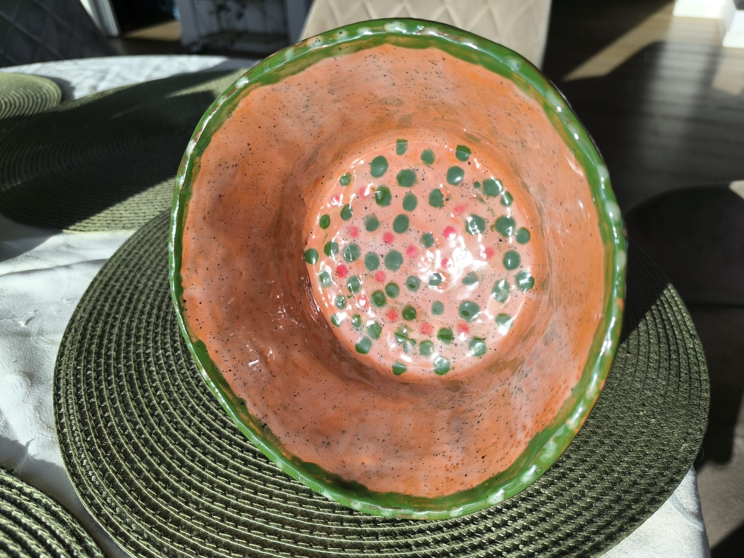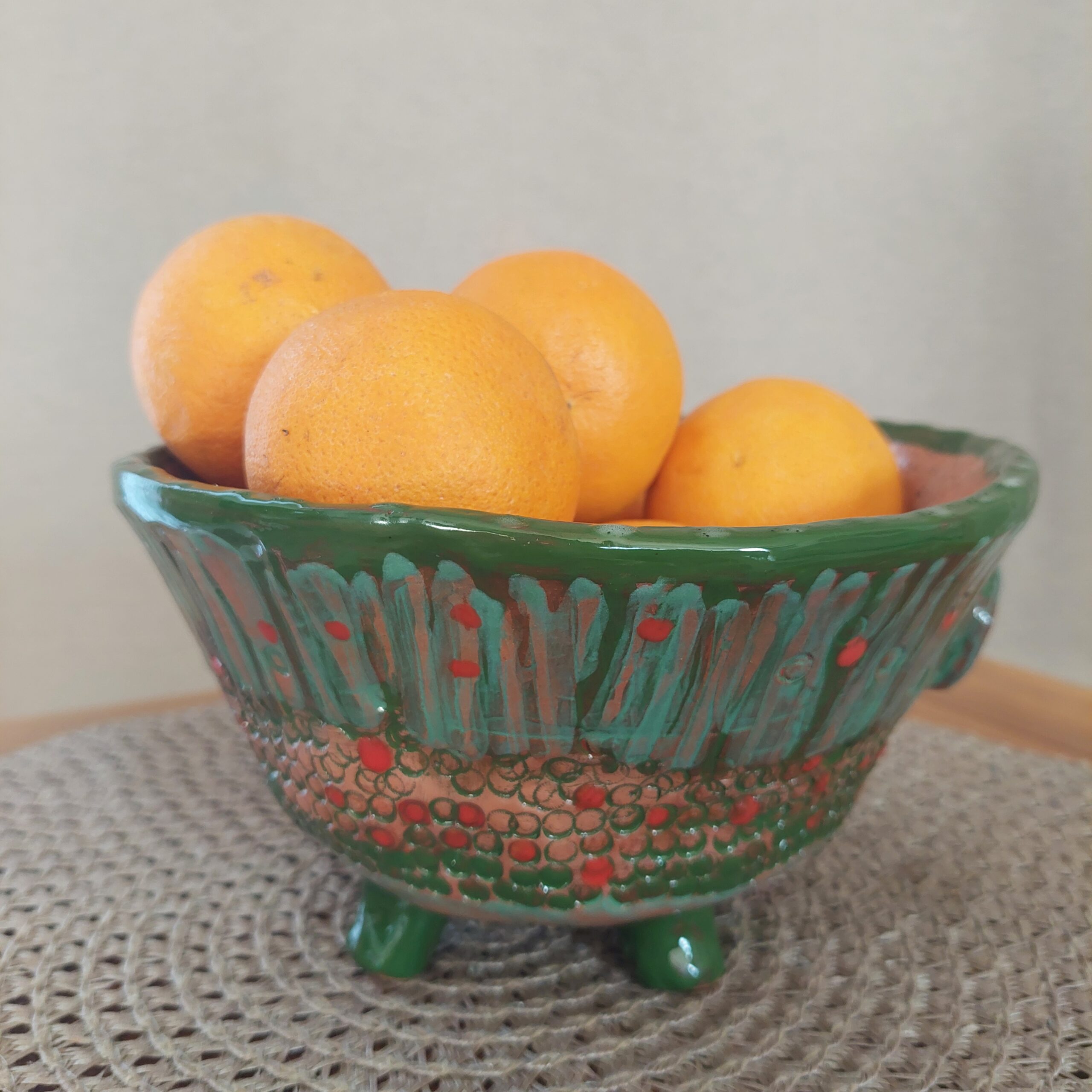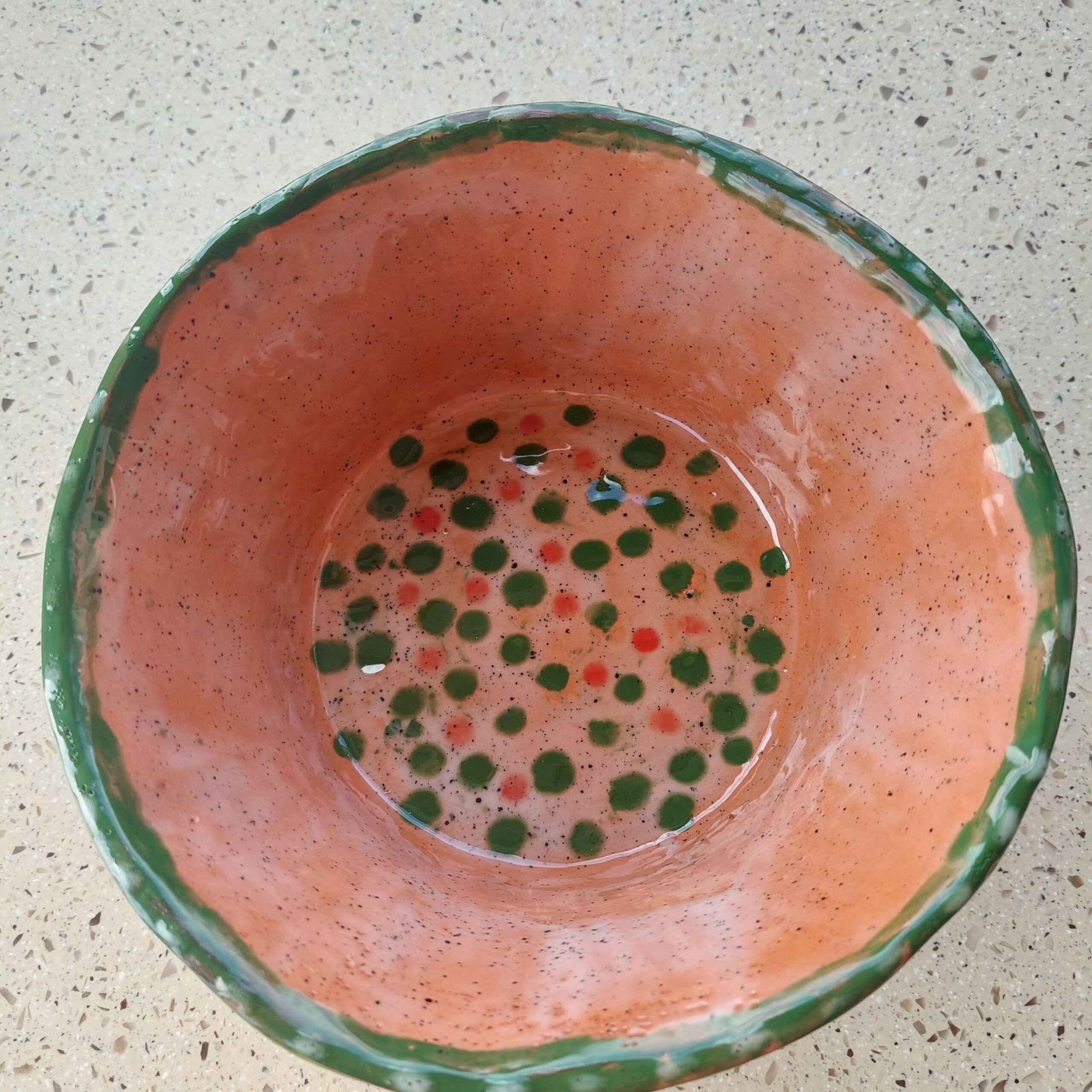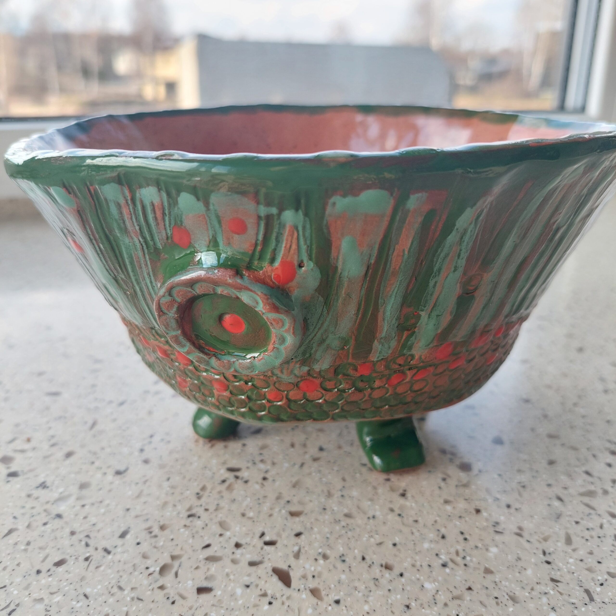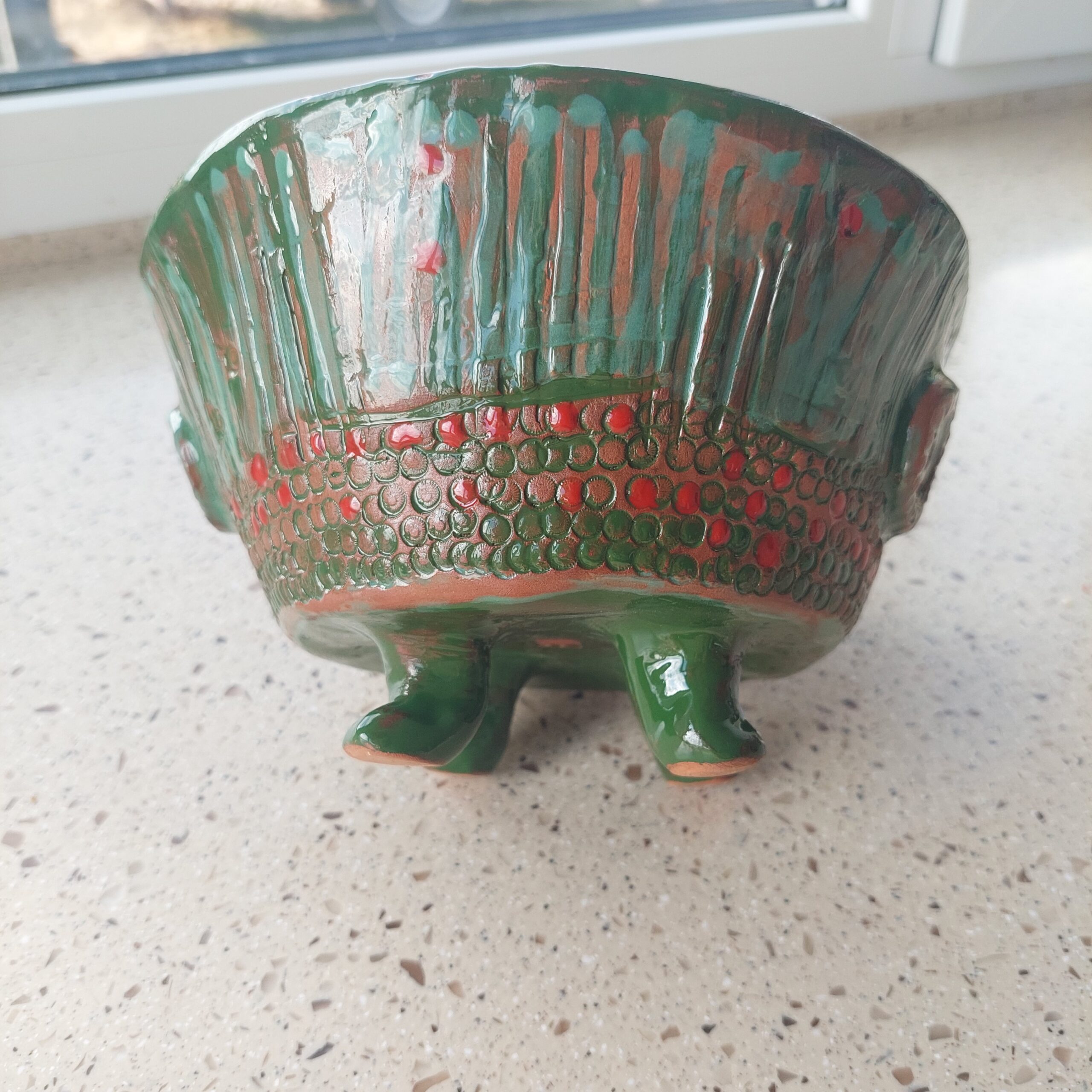 Keraminis rankų darbo dubuo „Žali taškai“. Rudasis molis, glazūra. Tinka maistui arba kaip vazonėlis sukulentams. Skersmuo 18 cm, aukštis su kojelėmis 11 cm. Spalvos: rausva, žalia, raudona.