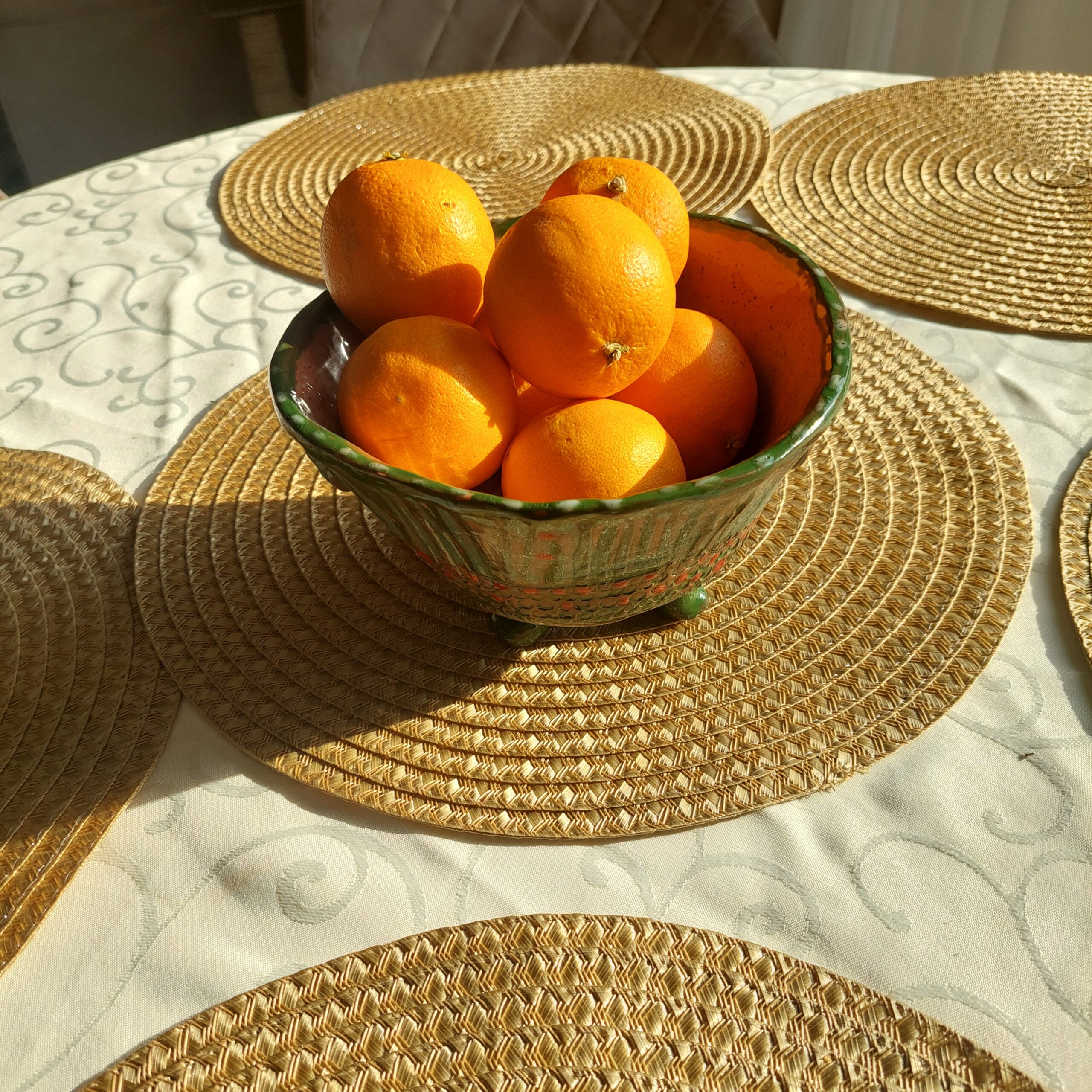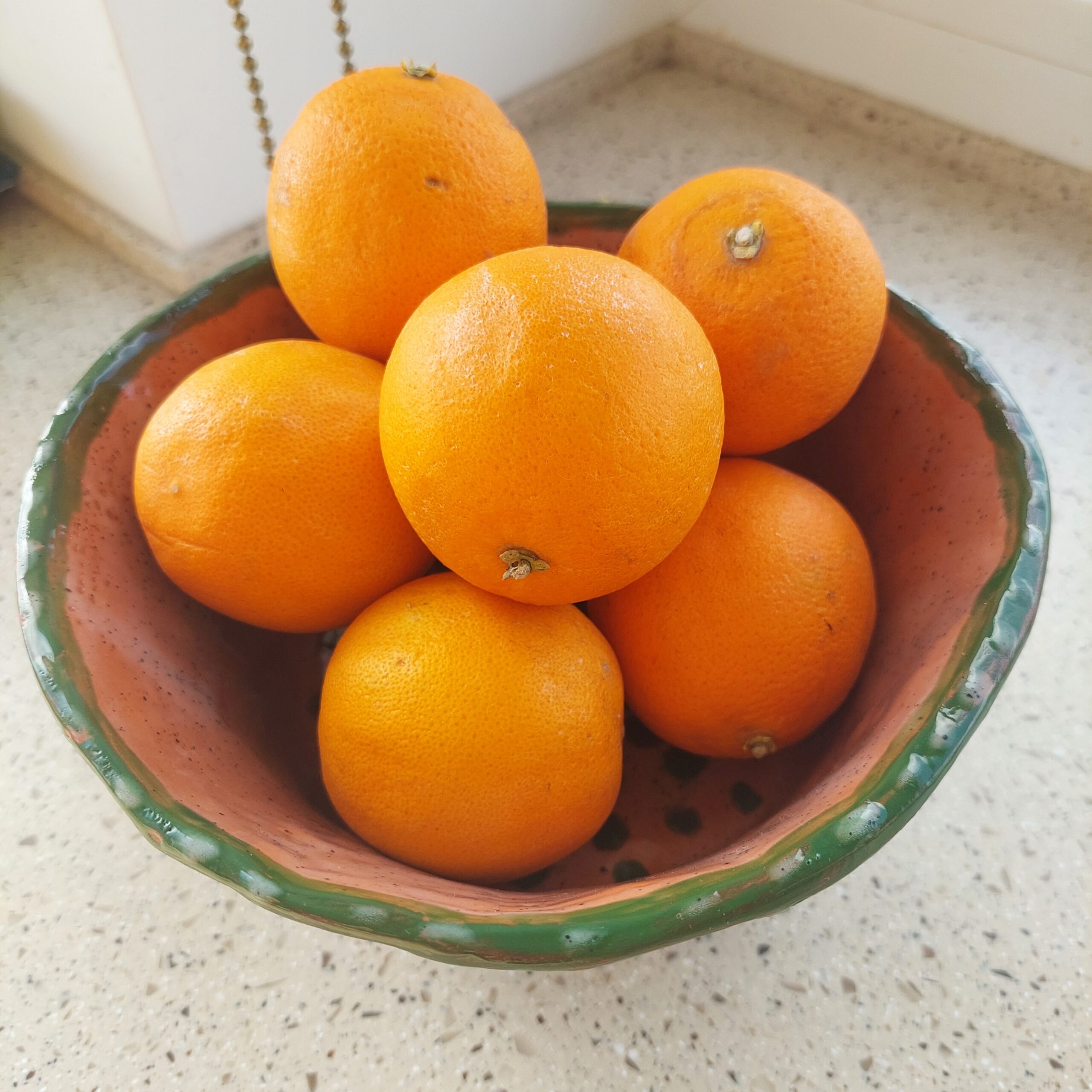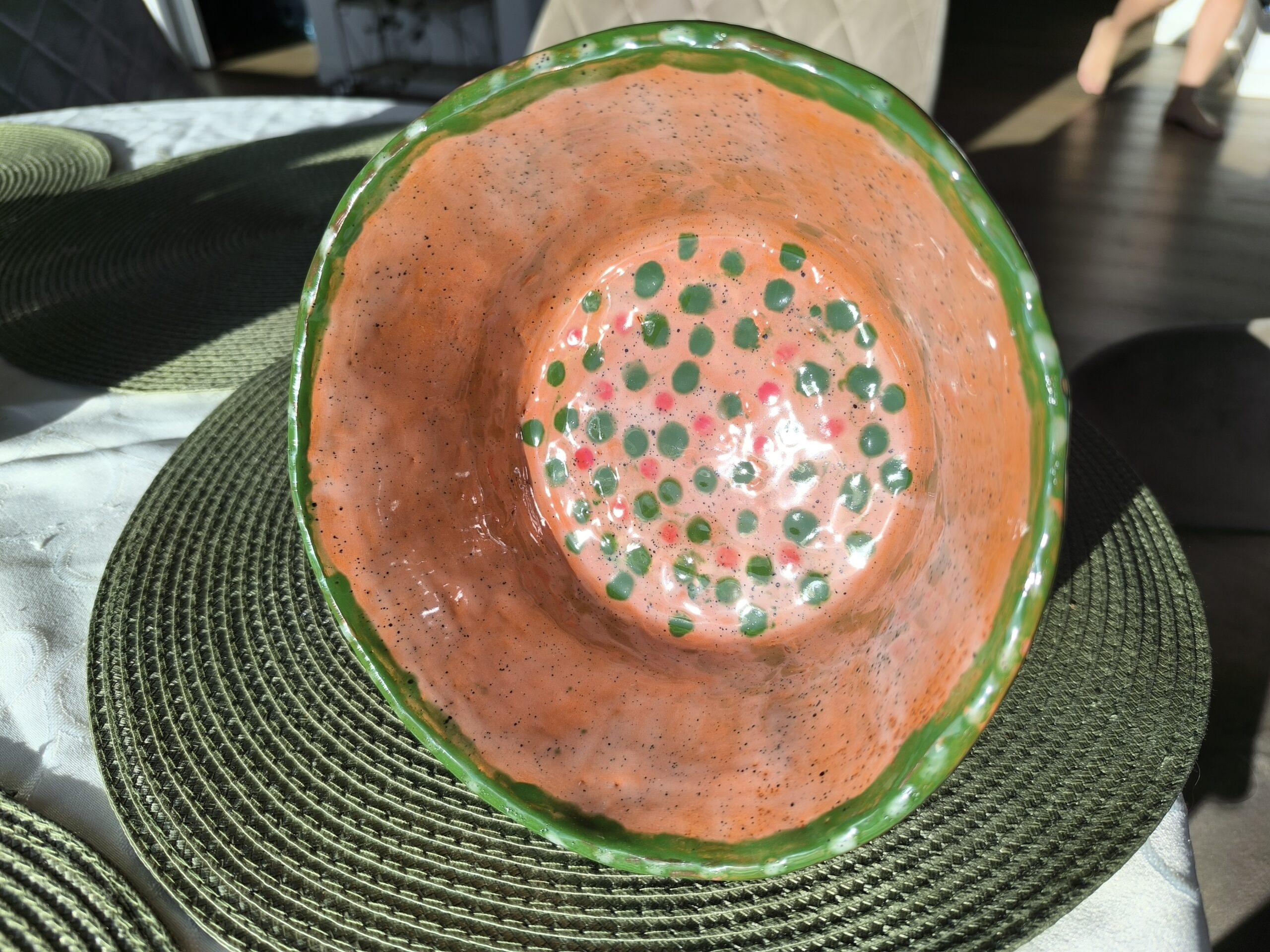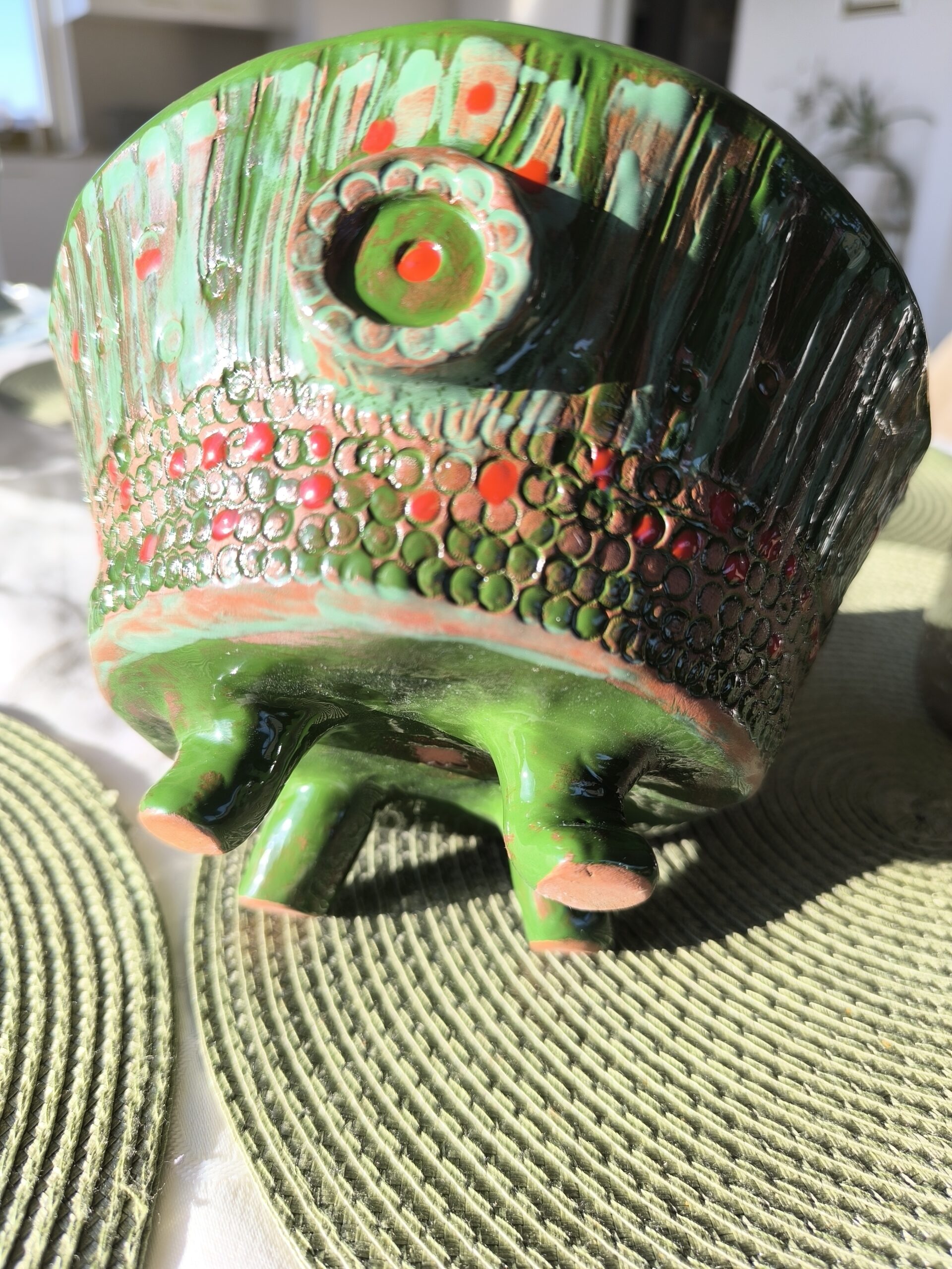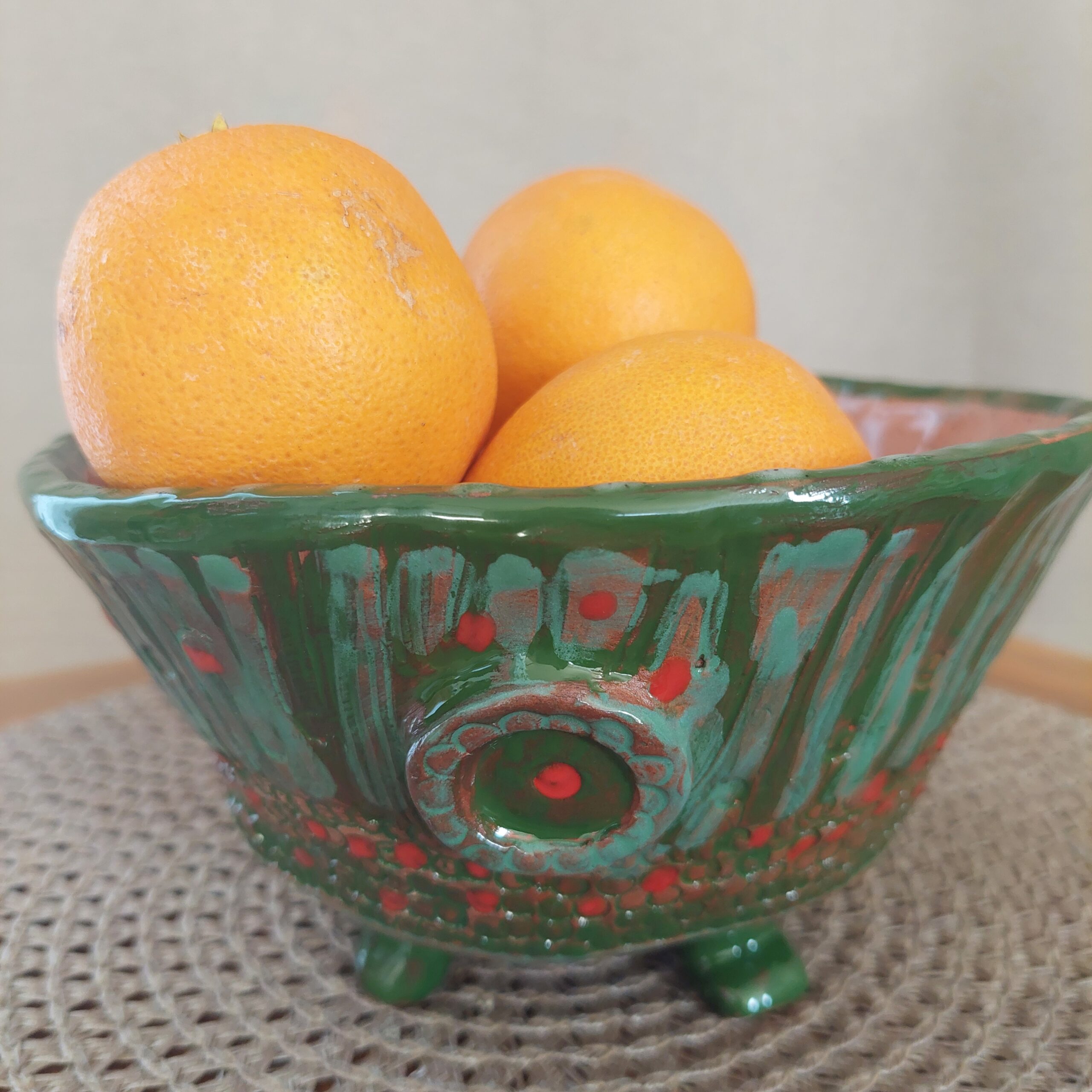Keraminis rankų darbo dubuo „Žali taškai“. Rudasis molis, glazūra. Tinka maistui arba kaip vazonėlis sukulentams. Skersmuo 18 cm, aukštis su kojelėmis 11 cm. Spalvos: rausva, žalia, raudona.
