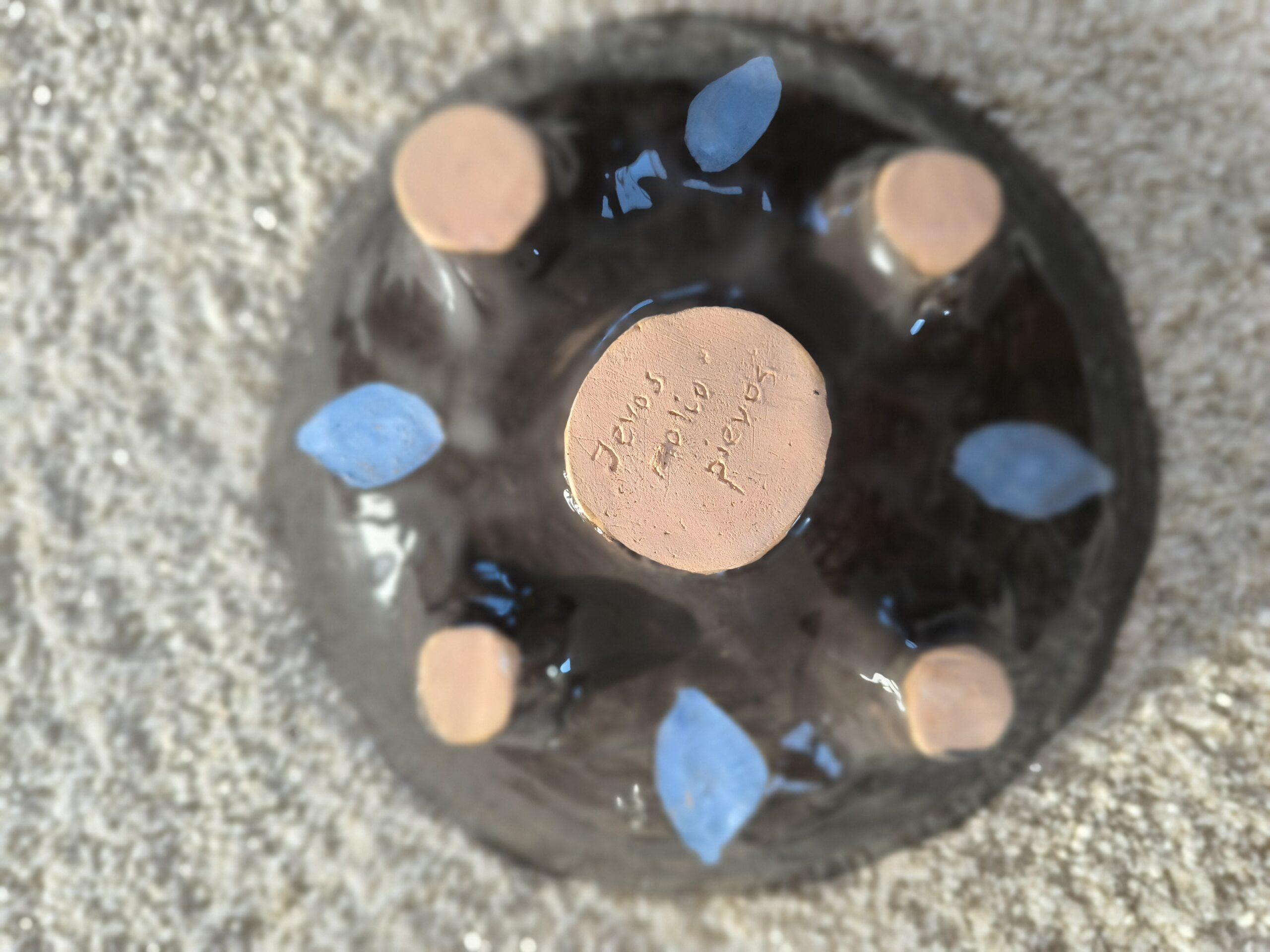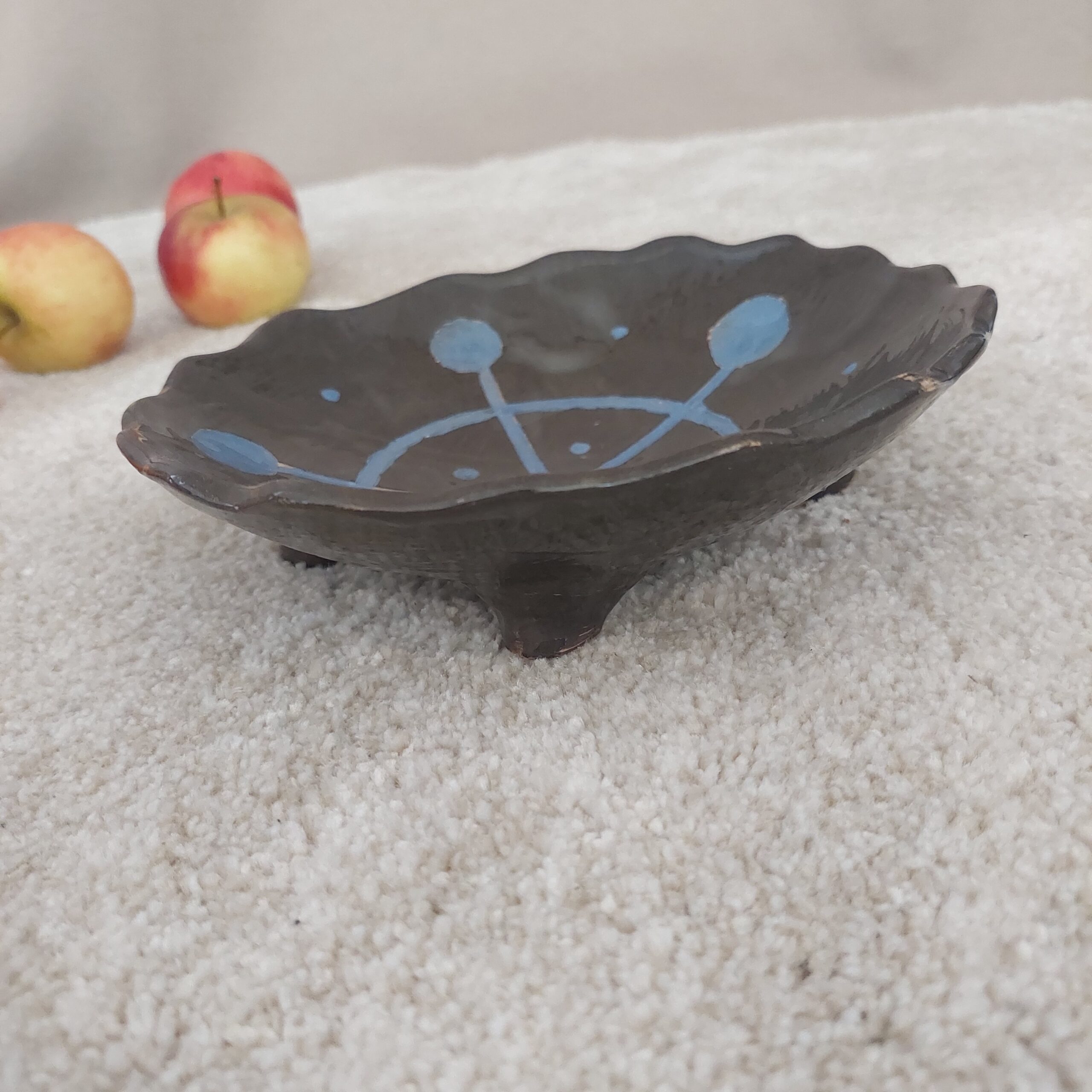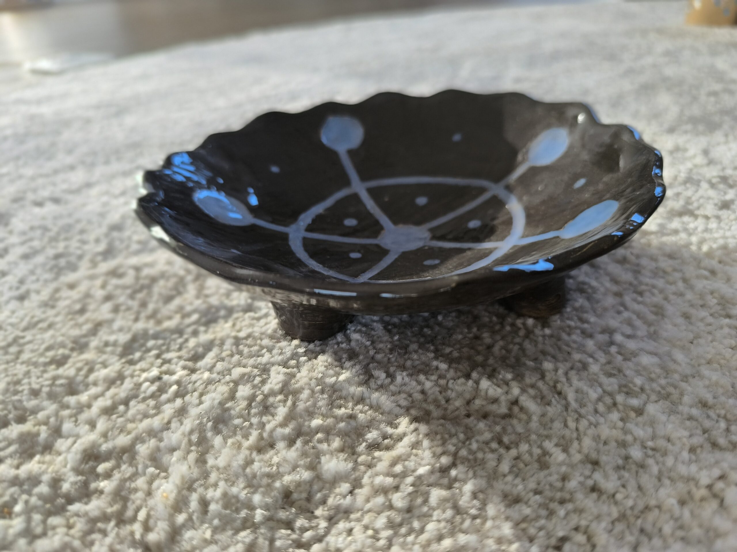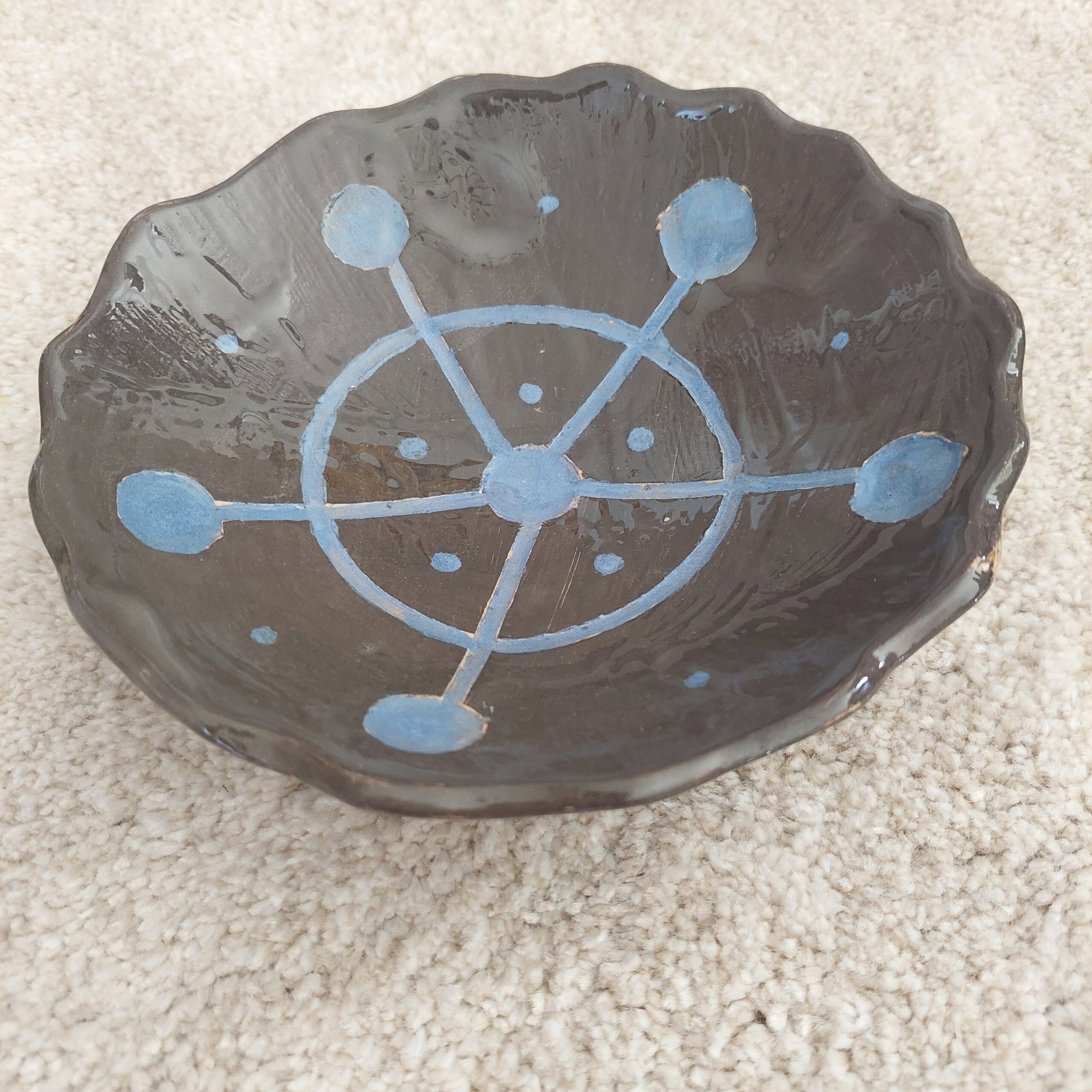 Keraminis rankų darbo dubenėlis „Žvaigždynas“, skirtas laikyti įvairius maisto (ir ne tik) produktus. Gelsvasis molis, angoba, bespalvė glazūra. Skersmuo 18 cm, aukštis 5 cm. Spalvos: ruda, mėlyna