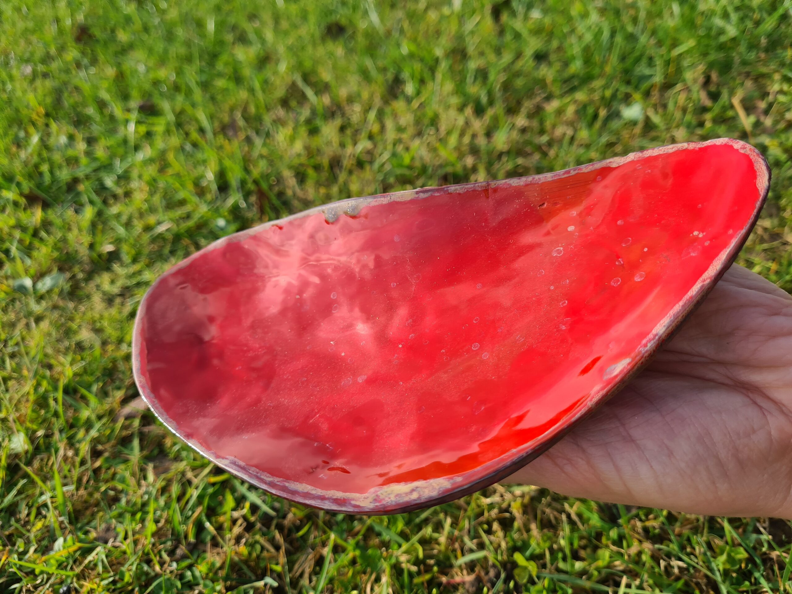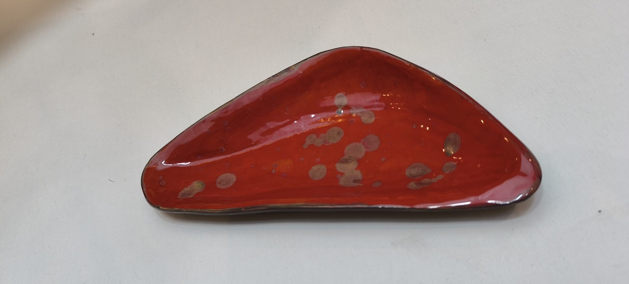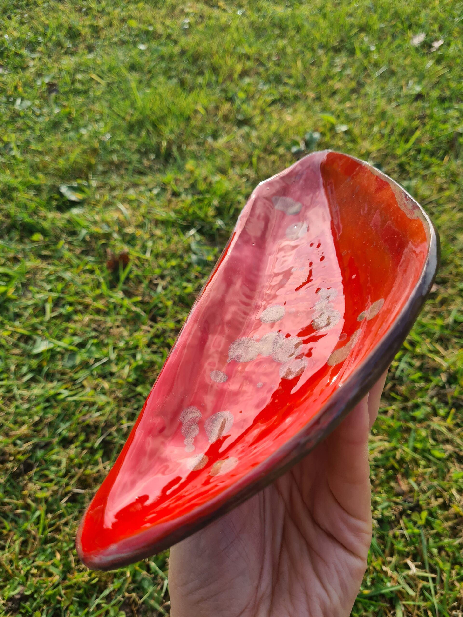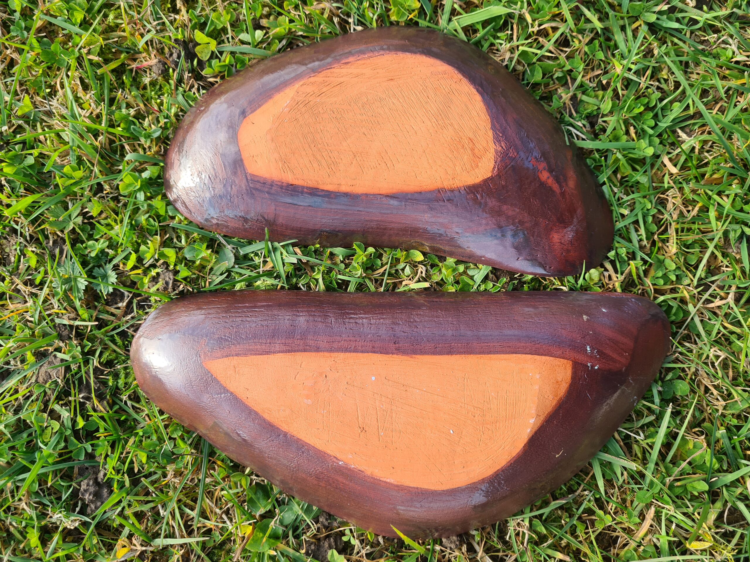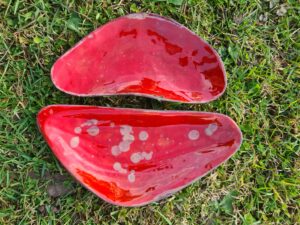 Keraminės lėkštelės. Raudonas molis. Bešvinė glazūra. Ilgis ~23 cm, plotis ~10 cm. Tinka maistui.